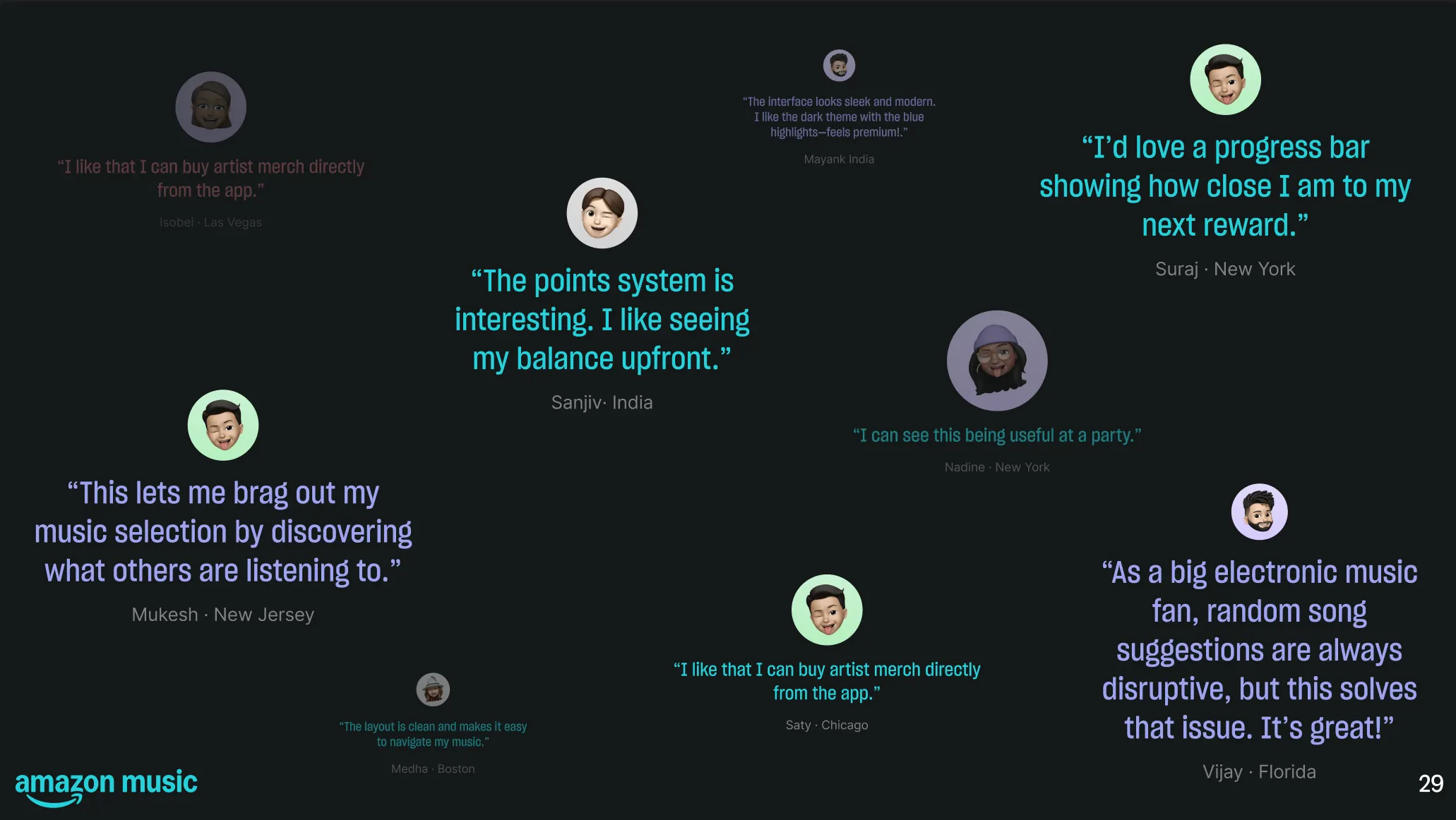 I would explore the following features through early testing in small groups to see how it impacts the way people perceive Amazon music.
