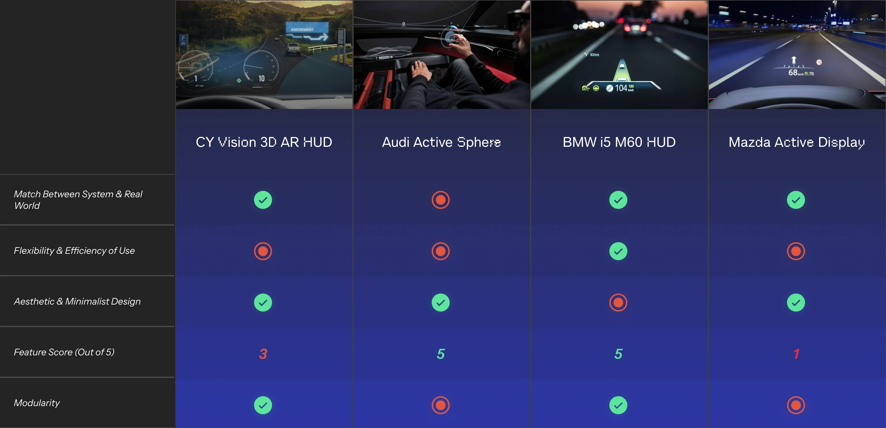 Before we dive into research, we performed a structured heuristic evaluation across competing products. By applying defined heuristics, we were able to condense insights in the current landscape of HUD technology and recognise existing gaps. Additionally, we developed two custom heuristics tailored to the automotive and HUD context: